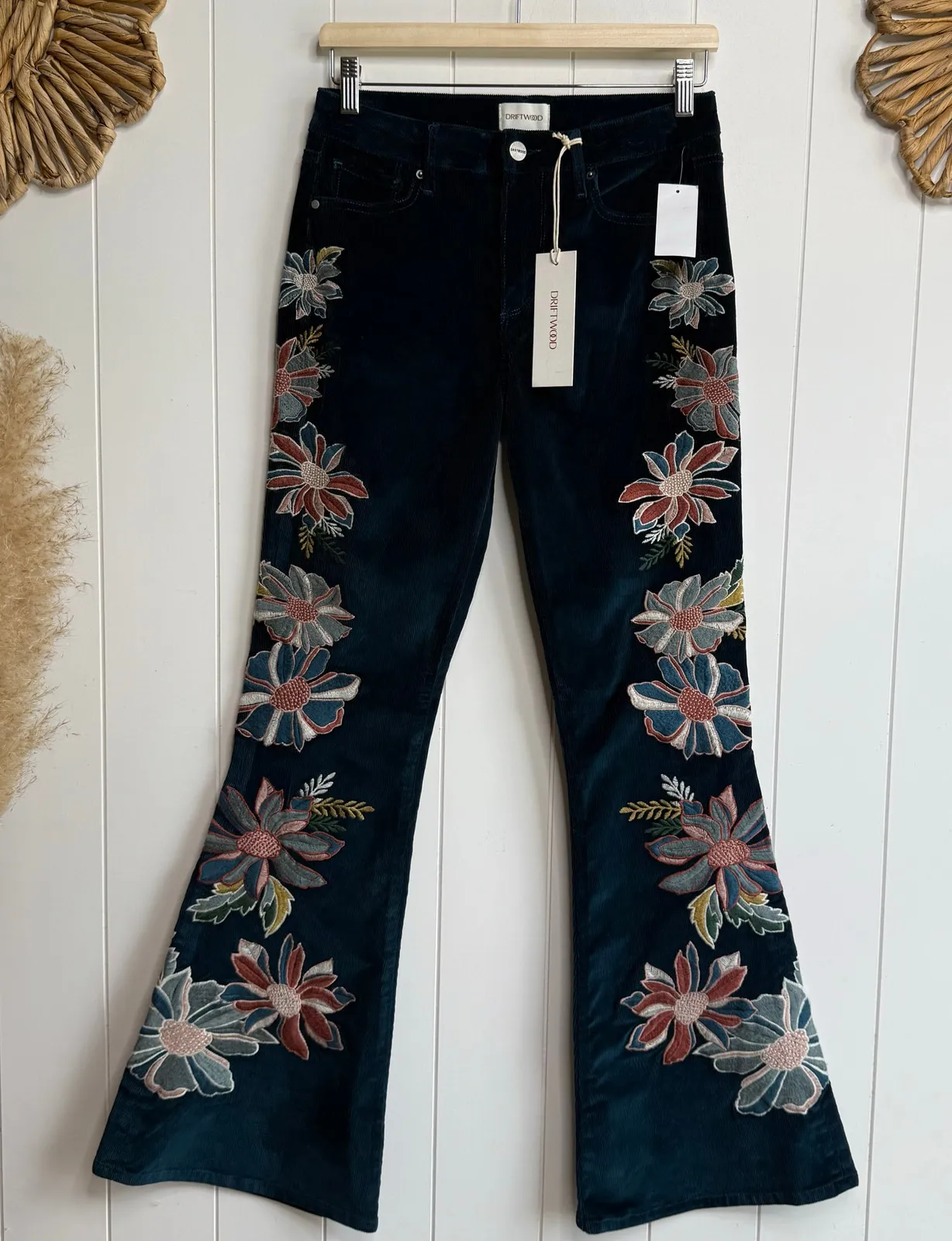 Driftwood x Free People corduroy flare pants high waisted floral embroidery Stunning! Condition: N... Show more