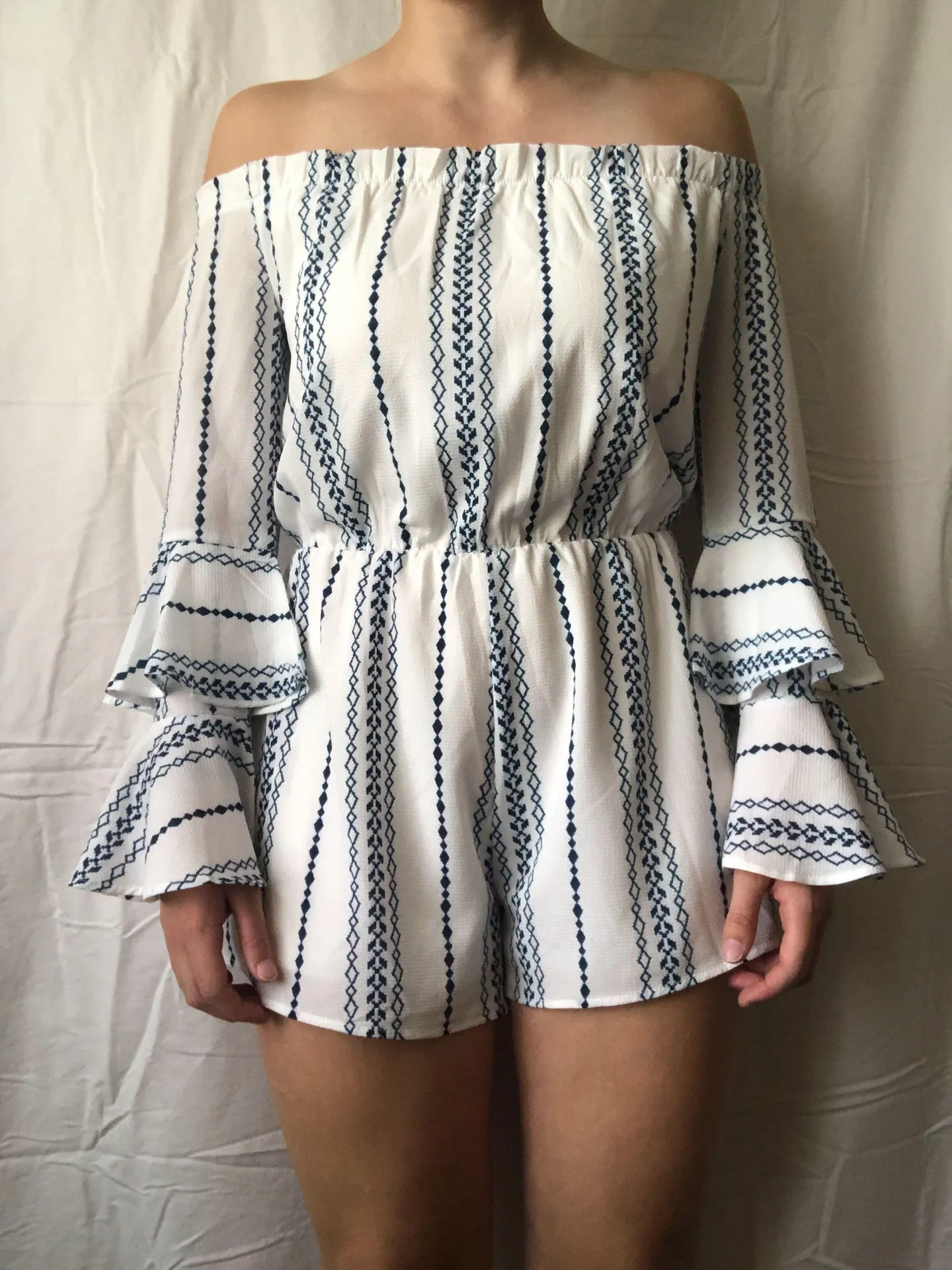White off the shoulder long sleeve romper. Has a layer underneath so it's not see-through. Super com... Show more