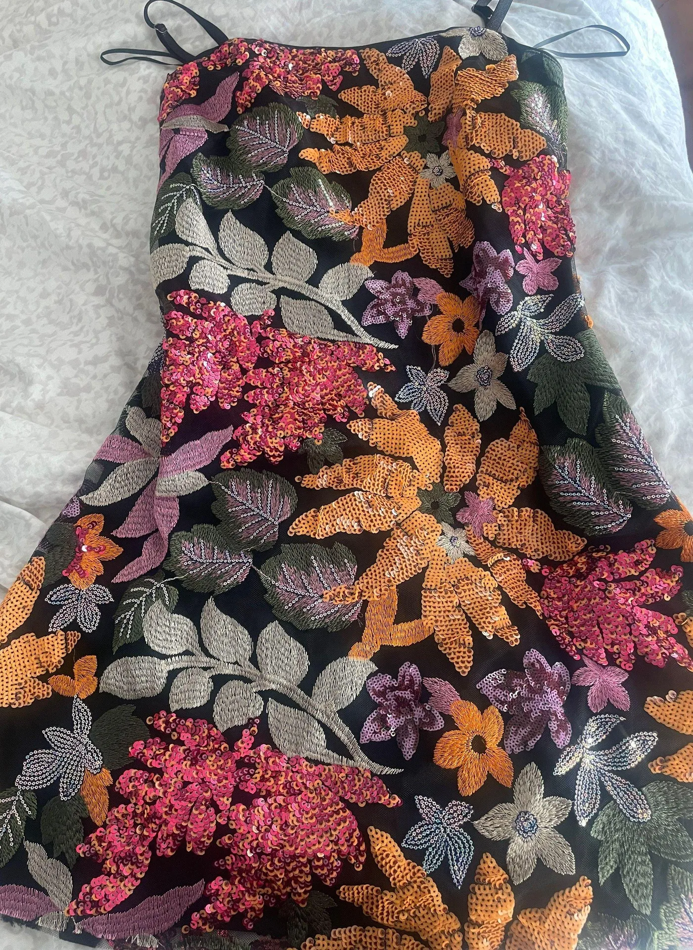 This dress is gorgeous, hits mid thigh with good top and bottom coverage! Never been worn, saved it... Show more