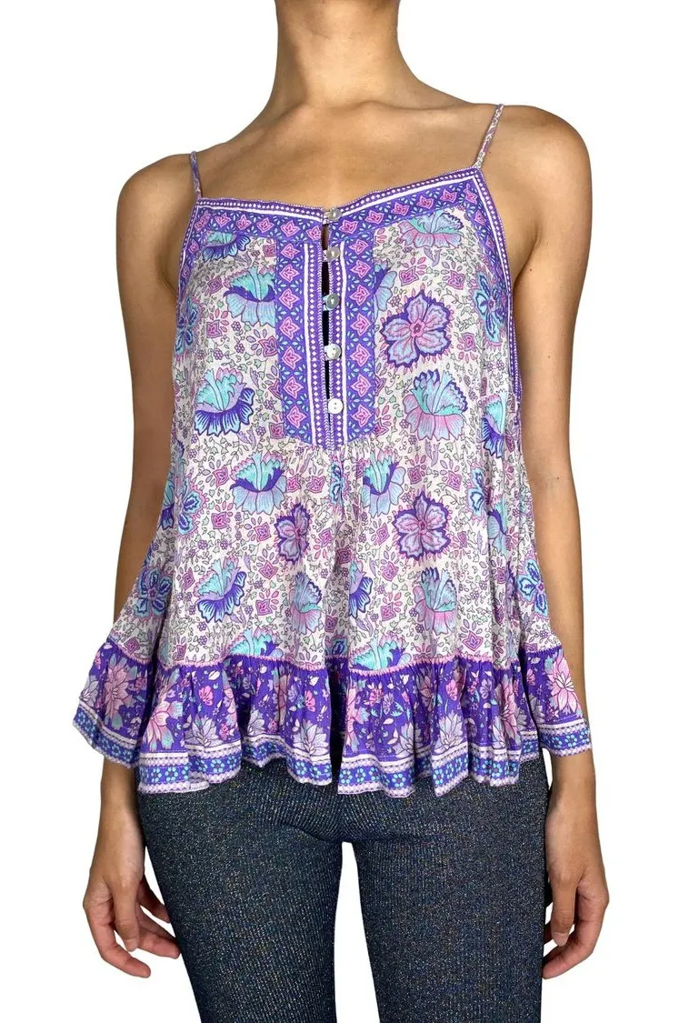 Spell & the Gypsy Collective Button Front Floral Printed Sleeveless Top Size S Sleeveless Button front Adjustable strap Ruffle hem Rayon blend Hand wash Perfect for beachside strolls, summer festivals, or adding a dreamy, romantic touch to any outfit.