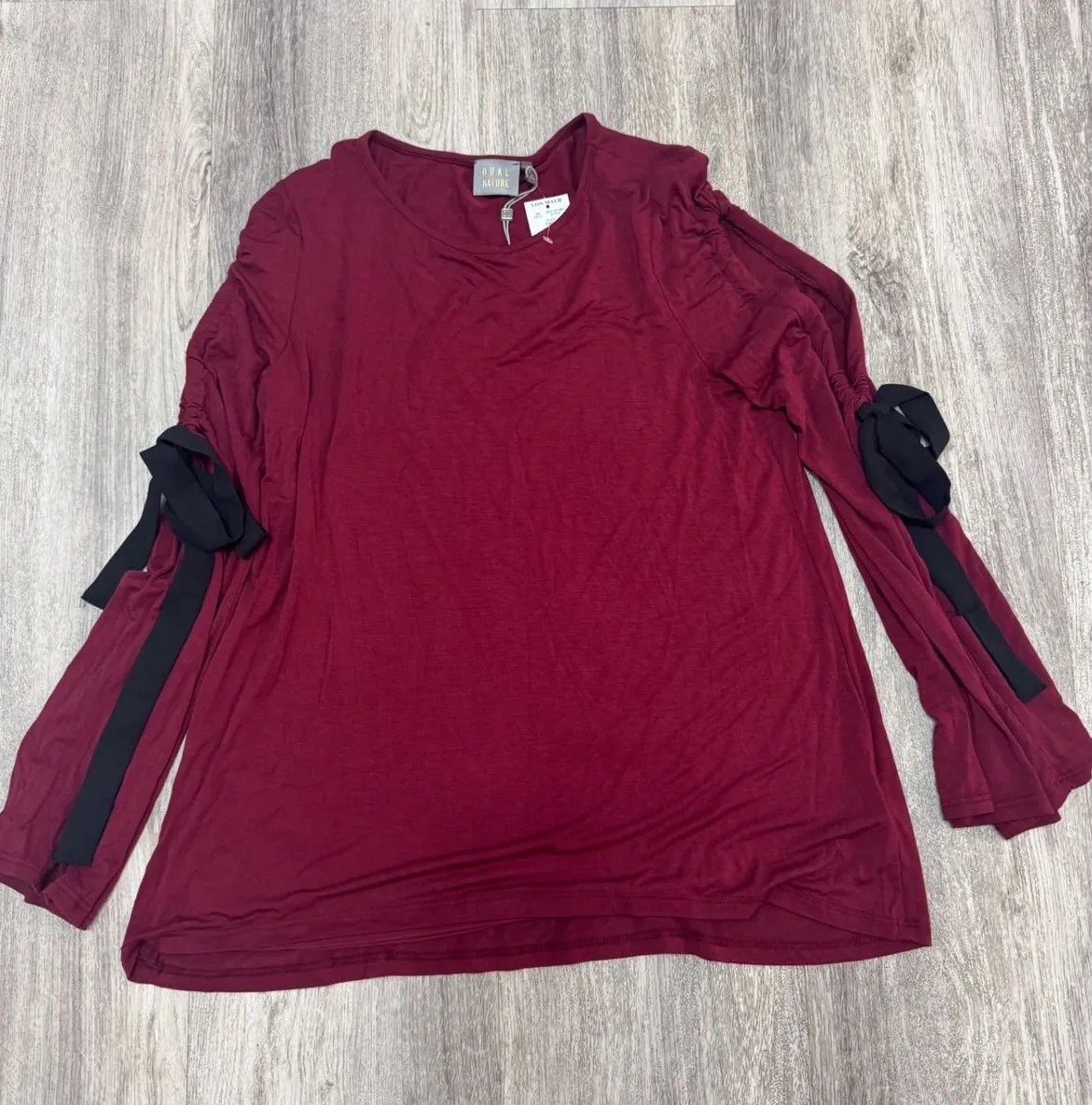 DUAL NATURE burgundy long sleeve top with ruched detailing on the sleeves and contrasting black tie accents. The top has a crew neckline and a flattering A-line silhouette. The sleeves are open in the where ruched detail starts. Bell sleeves with ties. Measurements: • Bust: 21 in • Length: 28 in Type: Blouse Department: Women Style: Tunic Material: Modal, Spandex, Polyester Neckline: Round Neck Sleeve Length: Long Sleeve Sleeve Type: Bell Sleeve Pattern: Solid Accents: Bow, Strap Features: Stretch Fit: Relaxed Keywords: dual nature, burgundy top, long sleeve, ruched sleeves, tie detail, womens fashion, casual top, basic tee, everyday wear, comfortable, trendy, modern, chic