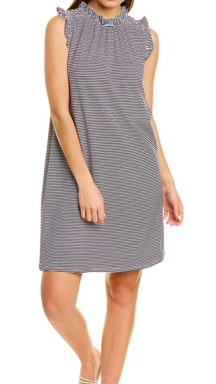Duffield Lane striped dress. Navy and white. About 37” from shoulder to hem. Ruffled collar and cuffs. Keyhole back with button and loop closure. Size XL. New! Cotton || Spandex 1