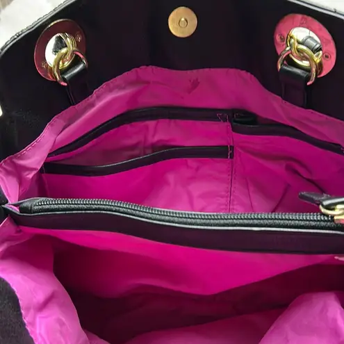 🖤 Excellent Preloved Condition Nicole Miller Black Quilted Shoulder Bag Stylish. Spacious. Sophisticated. Elevate your everyday look with this stunning Nicole Miller shoulder bag. Featuring a luxe quilted design with bold gold-tone stud accents, this bag blends timeless glamour with modern practicality—perfect for daily use or dressing up your look. • Sleek black exterior with quilted texture and circular gold-tone stud details • Gold-tone hardware and decorative accents for a luxe finish • Fixed double handles + detachable, adjustable crossbody strap = carry it your way • Two exterior storage options: • Snap-entry pocket in front • Zippered pocket in back • Main zippered entry opens to a silky bright pink lining for a fun pop of color • Interior includes: • Zippered pouch • Drop-in slip pockets for phone, keys, and more • Structured shape with ample space—perfect for on-the-go style 📏 Measurements: • Height: 9” • Base Length: 11” • Base Width: 4” • Strap Drop: 11” This is the go-to bag when you want something stylish, roomy, and effortlessly chic. Nicole Miller delivers fashion and function in one glam package.