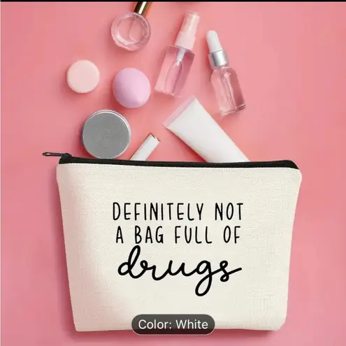 Canvas Cosmetic Bag for Women with Zipper - Durable Makeup Pouch 'Definitely Not A Bag Full of Drugs' Design - Portable and Lightweight Toiletry Bag - Unique and Funny Birthday Gift Idea - Non-, Unscented White canvas pouch with humorous text. Perfect for travel or daily use.