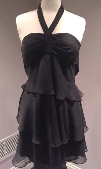 DUSK COLLECTION by Sheila Yen Black Ruffled Halter Tie Back Cocktail Dress Black above the knee dress with a halter neck and a tiered or ruffled skirt. Key features: • Color: Black. • Neckline: Halter neck style • Style: Tiered ruffled layers of fabric that create a flowy, layered effect. • Length: Above the knee length (falls above the knee) This combination of features creates a stylish and playful look. The halter neck adds a touch ot elegance and draws attention to the shoulders, while the tiered skirt adds movement and dimension. Purchased from Nordstrom for wedding Worn 1x to an event Size 4