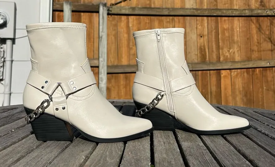 Worn twice, has a few marks on outside & staining on inside as shown Bold with moto attitude, the Keeler boots from DV Dolce Vita feature chunky chains and harness straps with ring hardware for a stylish statement. Features 2-1/2" heel Pointed toe Functional inside zip Cushioned insole, memory foam and lightweight, flexible sole for added comfort Harness strap, ring and chain hardware at ankle Manmade upper; manmade lining; manmade sole Ships in 1-4 days ❤️ -1678