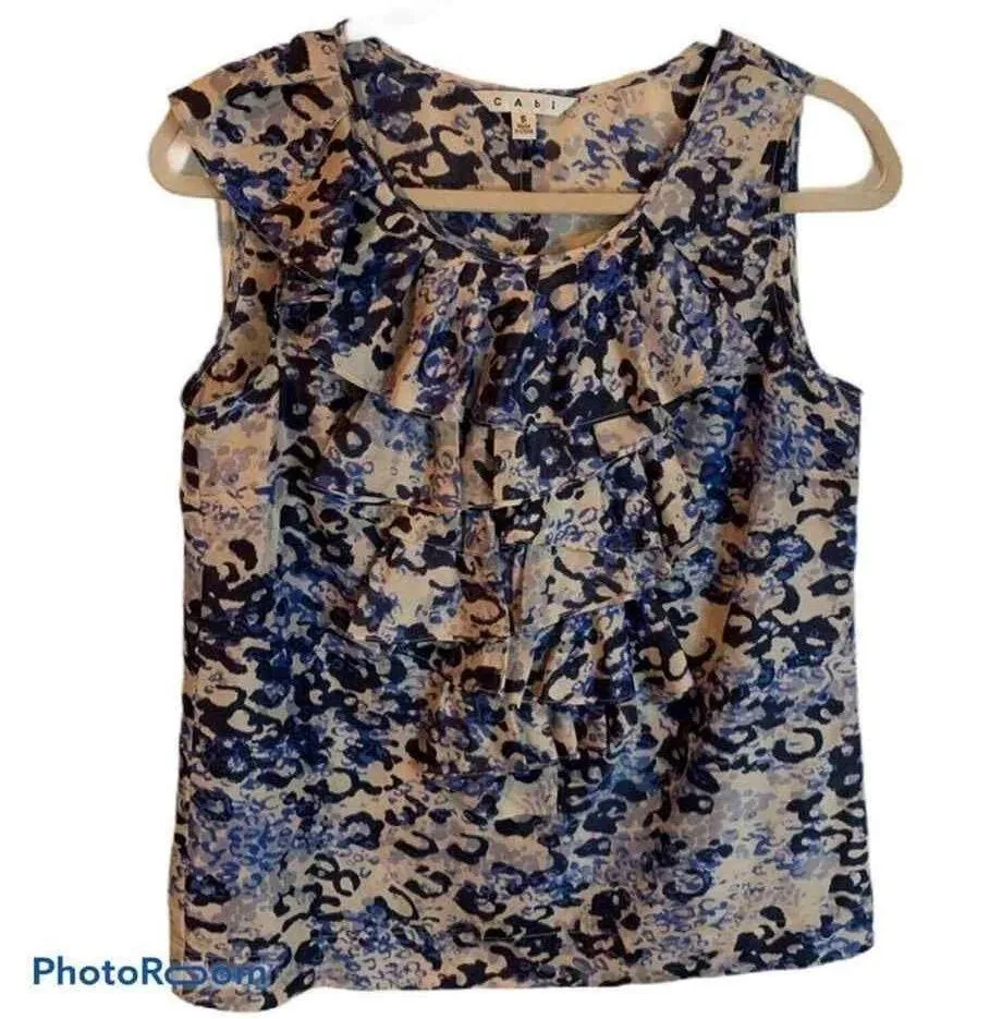 CAbi Silk Cascading Ruffle Blue Leopard Animal Print Sleeveless Top Blouse Small. Style 628 Preowne... Show more