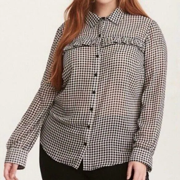 Torrid gingham check ruffle trim button down top. Black and white gingham check print long sleeve b... Show more