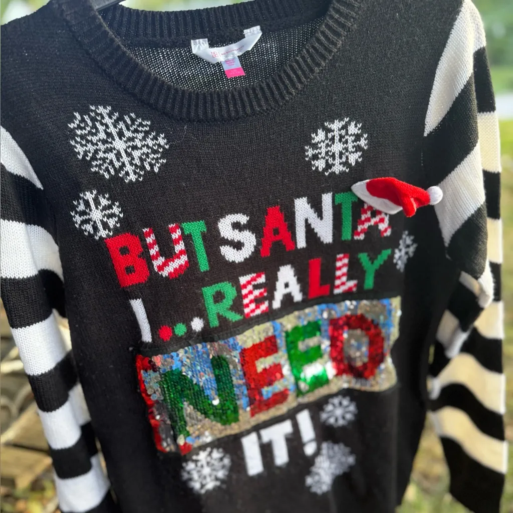 Festive black sweater with colorful holiday design. Features snowflakes and playful text. Perfect fo... Show more