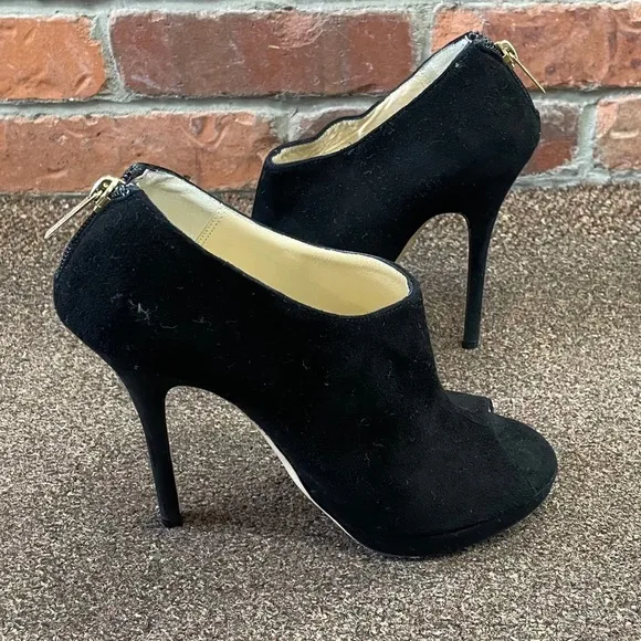 Jimmy Choo black suede peep-toe booties Size 36.5 Ankle zip, small platform, thin heel Made in Italy... Show more