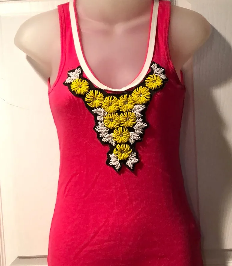 100% Cotton tank top with flowers of yellow and white seed bead with clear rhinestone centers, sewn... Show more