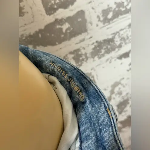 Stylish light blue jeggings with distressed accents. Perfect for everyday wear.