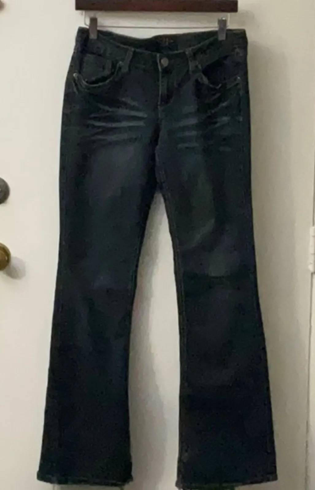 Style: 5 pocket, zip fly bootcut jean Color: Blue Size: 9 Waist: 16" Rise: 9" Inseam: 33" Condition: Good, frayed hems need hemming 67% Cotton 32% Polyester 1% Spandex Machine wash cold