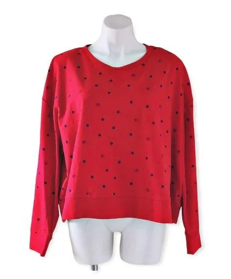 This cozy red sweatshirt from Earl features an all-over star print in blue. It has cuffed sleeves and hem , making it perfect to pair with your favorite bottoms. Details: - Crew neck - Long sleeve - Cotton blend 57% Cotton, 43% Polyester Machine wash cold Approximate measurements laid flat - shoulder to hem 22” - underarm to underarm 26” - sleeve length 21”