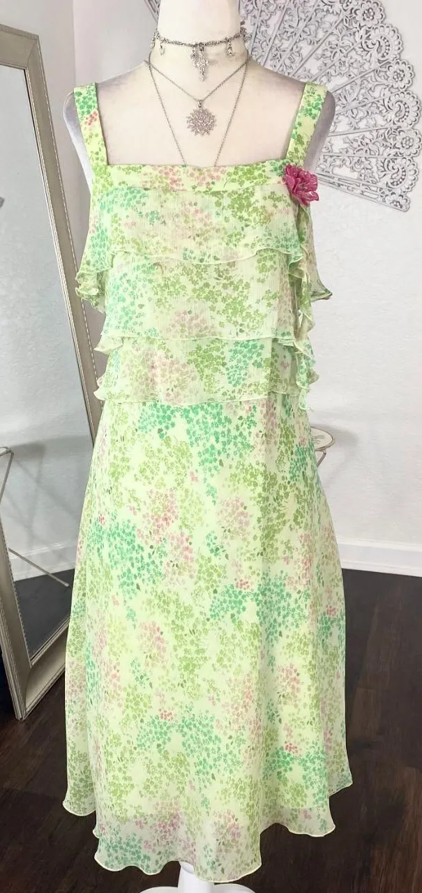 ✨ Early 2000's Frilly Floral Fairy Midi Dress ✨ ༓ Brand: I.N Studio ༓ Size: 10 / M ༓ Condition: very good ༓ stunning light green layered mesh midi dress, frilly layered details on neckline ༓ the rose flower is detachable with a safety pin ༓ so stunning, whimsical fairy bohemian ethereal, the perfect boho midi dress Measurements taken approximately and to the best of my abbilities: ༓ pits 18" ༓ single waist 17" ༓ length 44" Tags: #fairy #celestial #whimsygoth #boho #ethereal