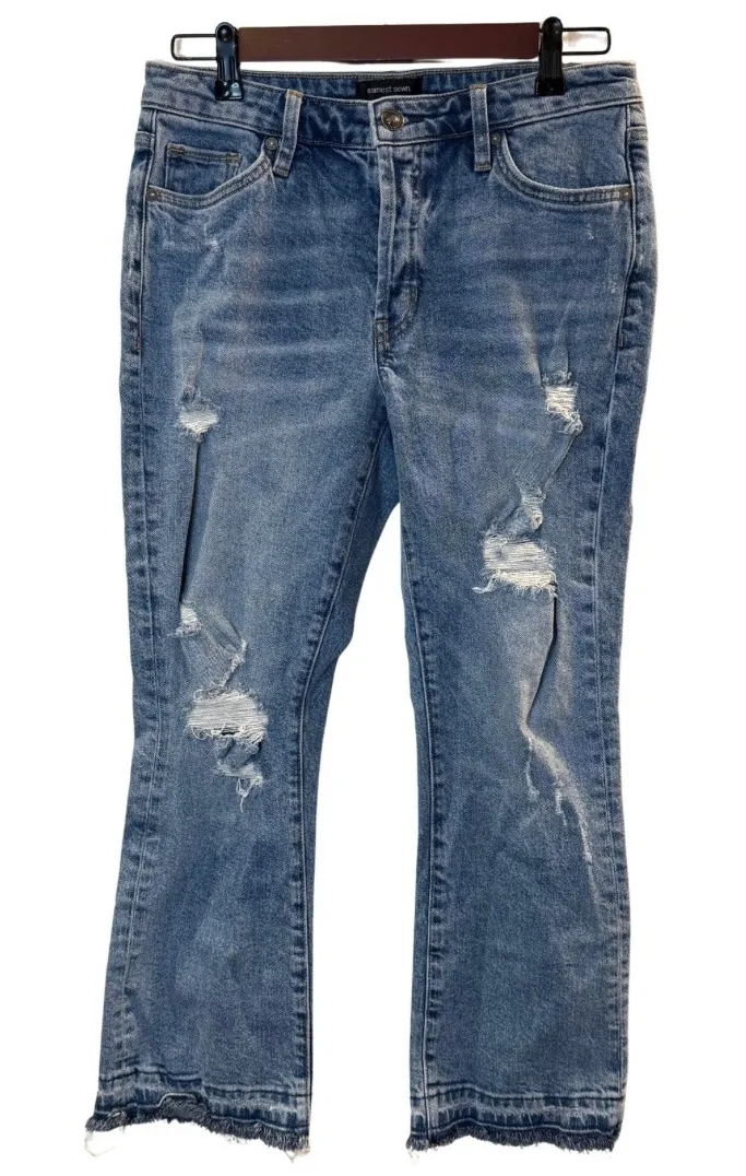 Light wash distressed Earnest Sewn Jane mid rise flare crop jeans. In good used condition. Size 28 5 pocket Button fly 99.4% cotton .6% spandex 14 1/2” waist 26” inseam 9 1/2” rise Smoke-free and golden retriever-friendly household