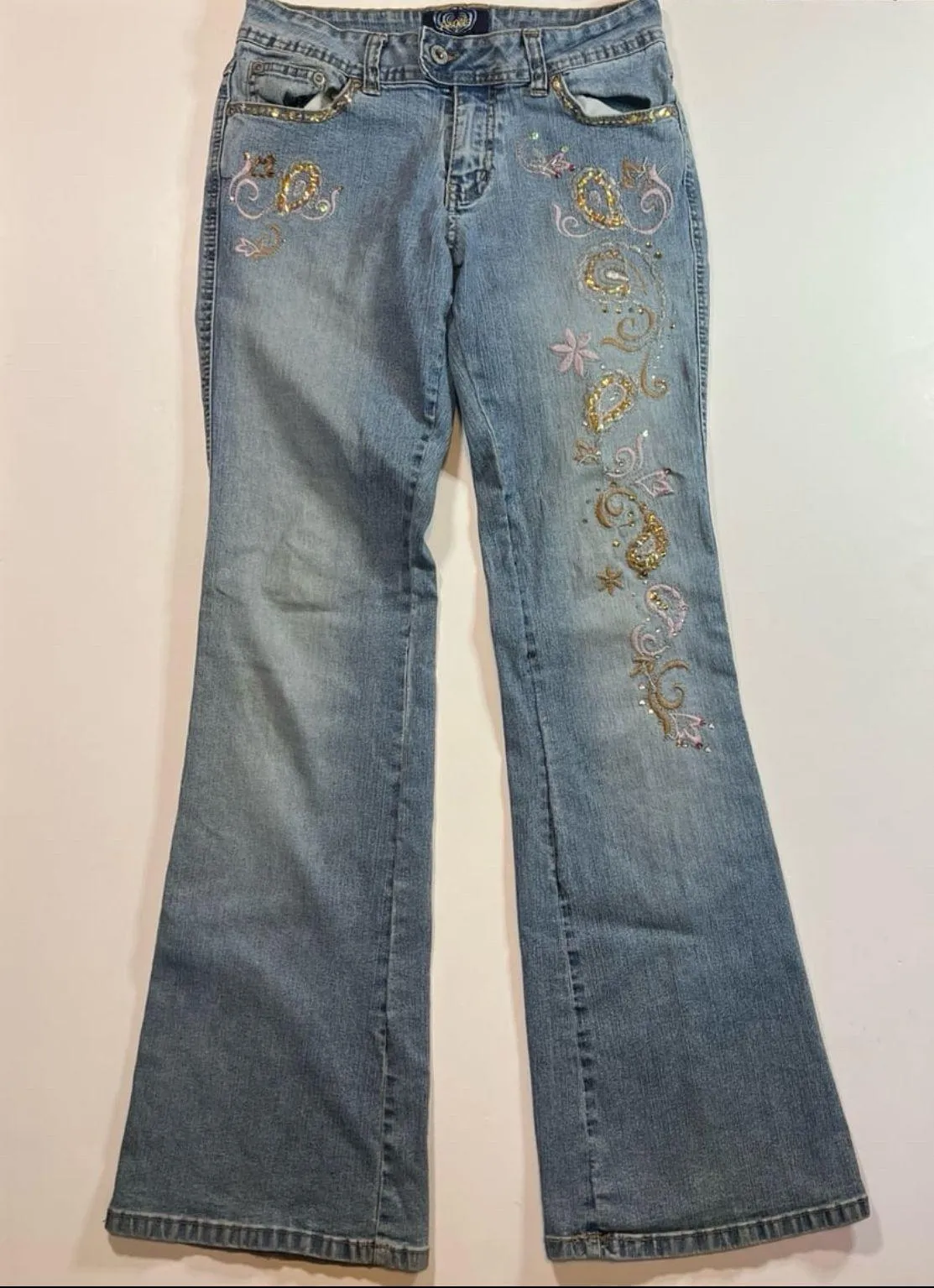 Beautiful Y2K angels flare jeans featuring the most amazing embroidery design on the thighs! These j... Show more