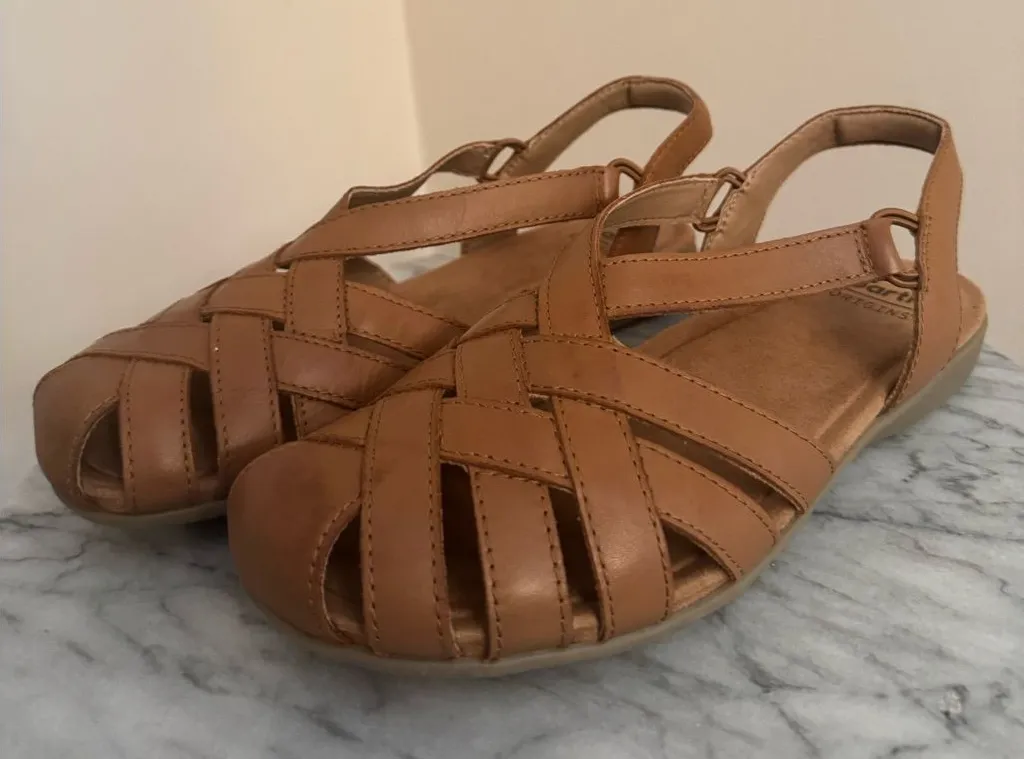 Earth Origins berry woven casual round toe slip on sandals in a size 10. Color brown. Shoes are made of premium genuine leather upper. In excellent like new condition- no stains, holes, or flaws. Size of shoe IS missing however from top to bottom the shoe measures 10.5” which is a 10 according to the earth size guide. Fast shipping!