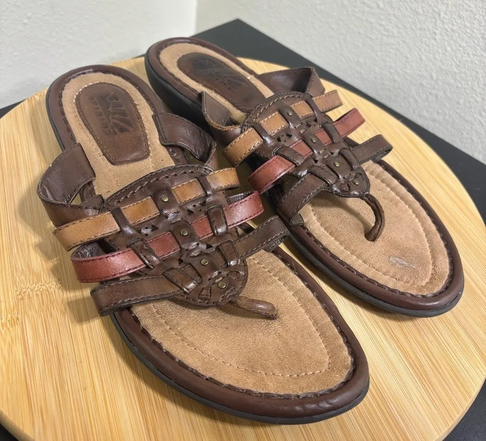 Earth Origins leather brown thong sandals in the size women's 10. The sandals have multi shades of b... Show more