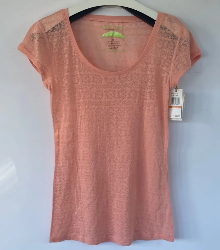 Condition: New With Tags Size: Medium Color: Coral / Peach / Pink Chic peach coral tee with delicate pattern. Soft and comfortable. Sheer burn out style. Perfect for everyday wear. Color may vary due to monitor or device settings.