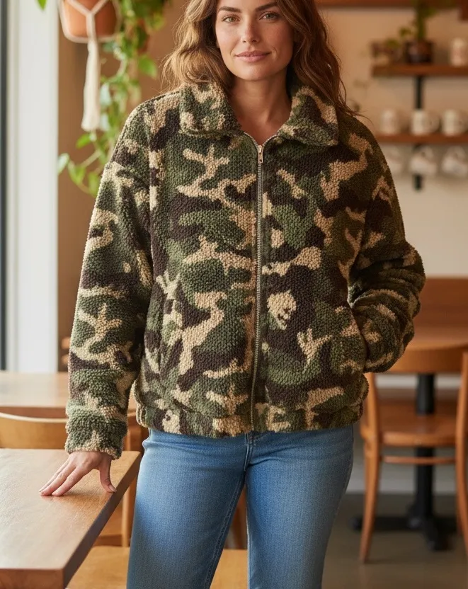 Stay cozy and stylish with this camouflage sherpa jacket. Perfect for layering in cooler weather Pr... Show more