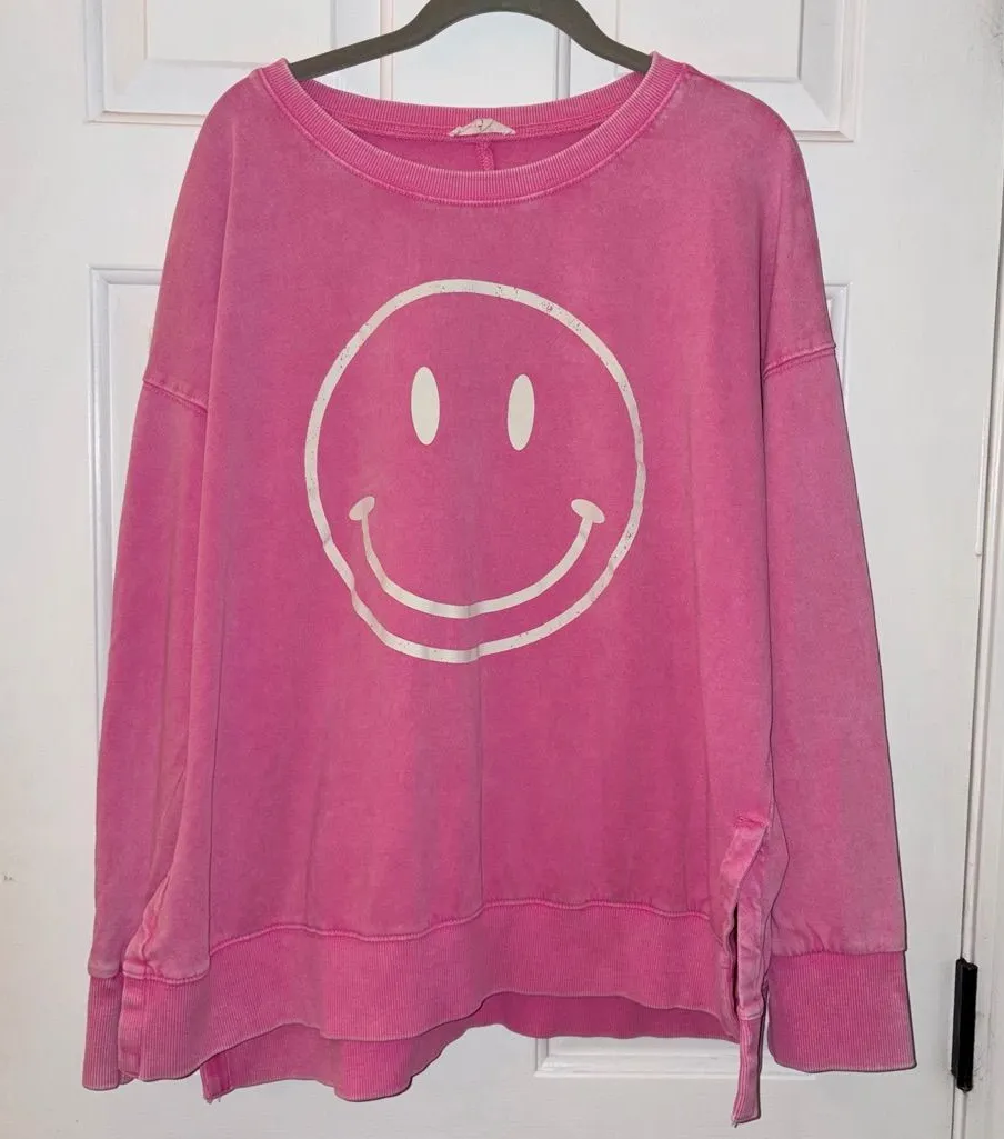 Size L * Washed loose fit pullover * Smiley face printed * Boxy and loose fit silhouette * Dropped s... Show more