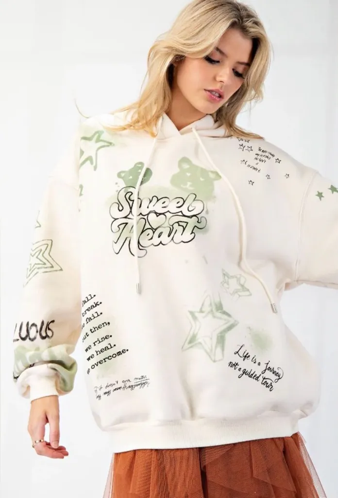 Stay cozy and stylish with the Sweet Heart Graphic Hoodie. Featuring a playful design in cream and g... Show more