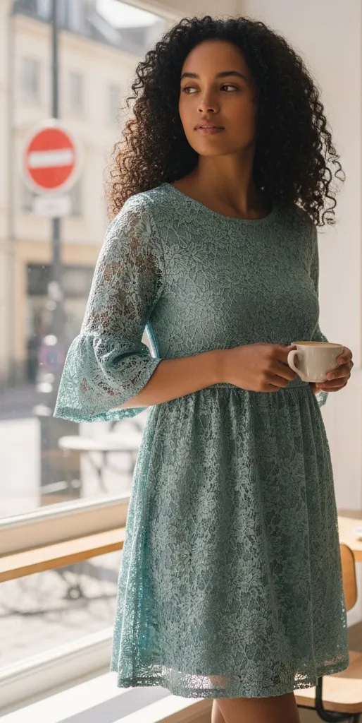 easel womens blue lace overlay dress. 3/4 flare sleeve, knee length. Scoop neck with lower scoop ba... Show more