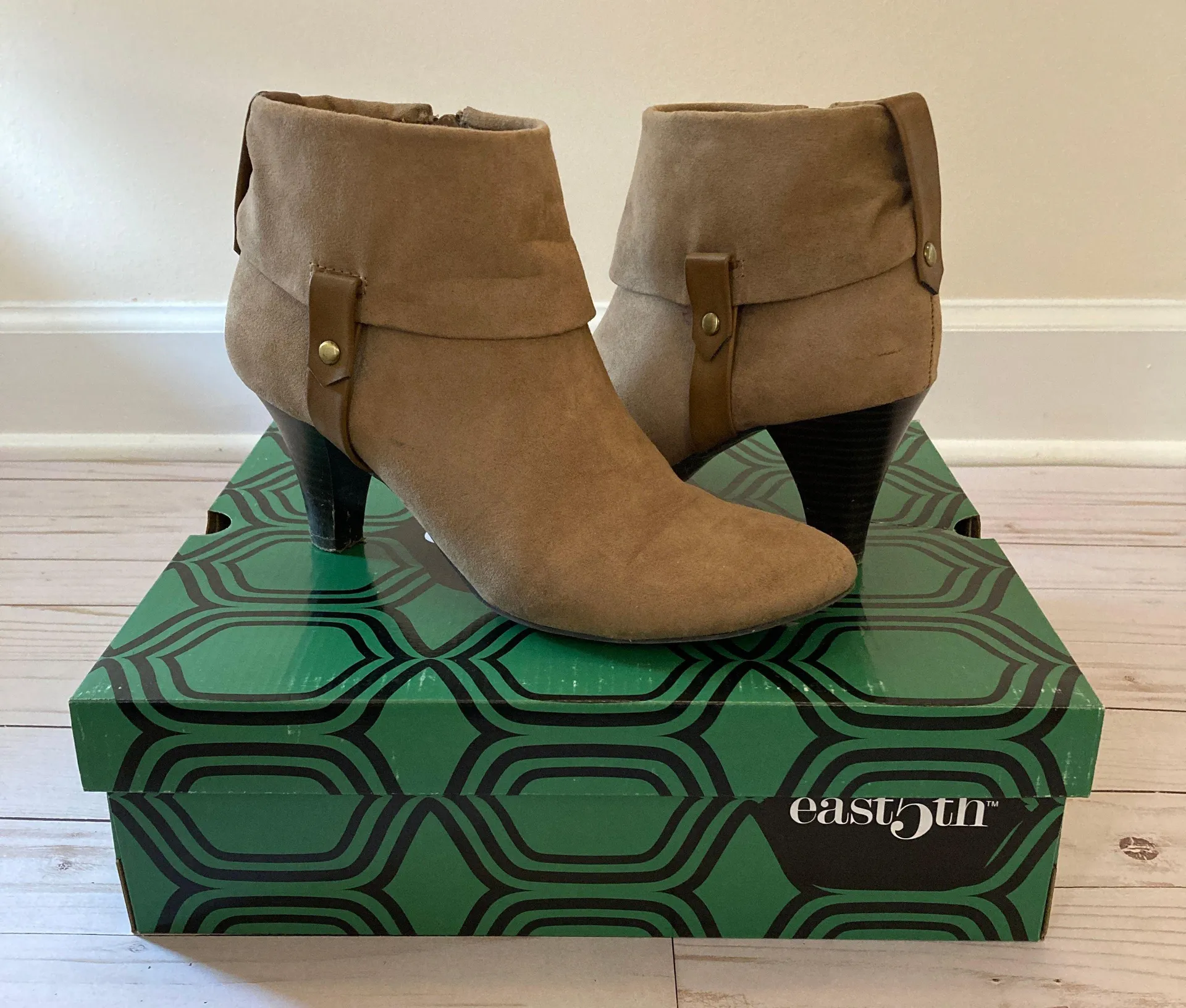 Taupe brown ankle booties with an almond toed shape by East 5th; great condition -flex foam technology -zippers on each shoe -button details -a faded black streak on the outer right shoe (see 7th pic) Heel height: 3"