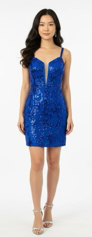 The EAST COAST BELLA Royal Blue Sequin Cocktail Dress is a stunning choice for various occasions such as weddings, parties, or formal events. This mini dress features a flattering V-neckline, sleeveless design with strappy sleeves, and a corset back closure for a sleek fit. Made from a blend of polyester and spandex, the dress is adorned with floral sequin accents, adding a touch of sparkle to the elegant silhouette. Women’s size 2 or XS 32” bust can be adjusted via tie back 26” waistline 33” mini length Built in cups Fully lined New