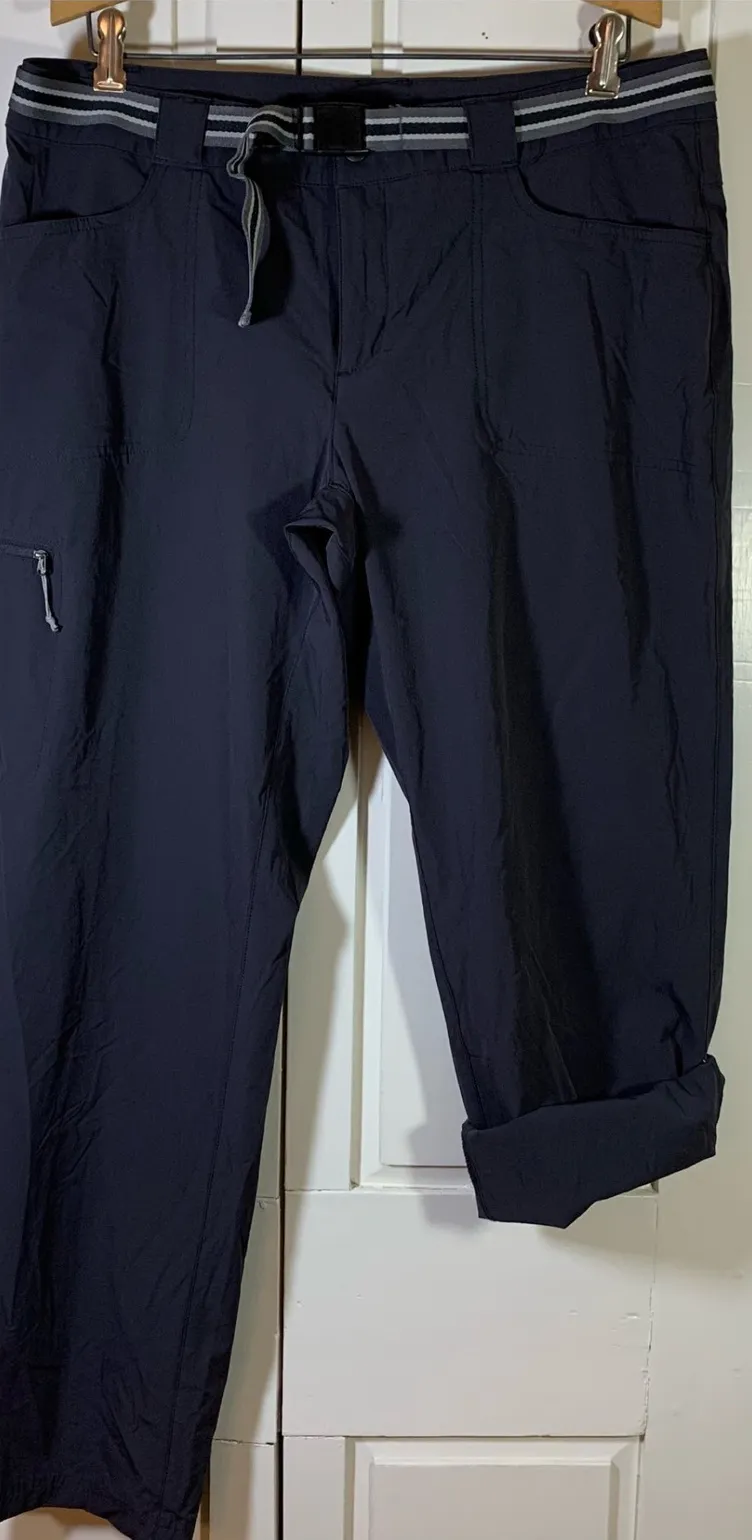 Eastern Mountain Sports Women's dark gray cargo pants by EMS. These versatile pants feature a comfortable elastic waistband with an adjustable drawstring and a striped belt. Designed for practicality and comfort, they include multiple pockets, including a zippered cargo pocket on the left leg. The rolled cuff detail adds a casual, stylish touch. Perfect for hiking, outdoor adventures, or casual everyday wear. Material: Nylon Country of Origin: Vietnam Unit Type: Unit Keywords: hiking pants, outdoor wear, travel pants, athletic bottoms, casual pants, zip pocket, drawstring waist, rolled hem, activewear, utility pants, comfortable fit, breathable fabric, quick dry