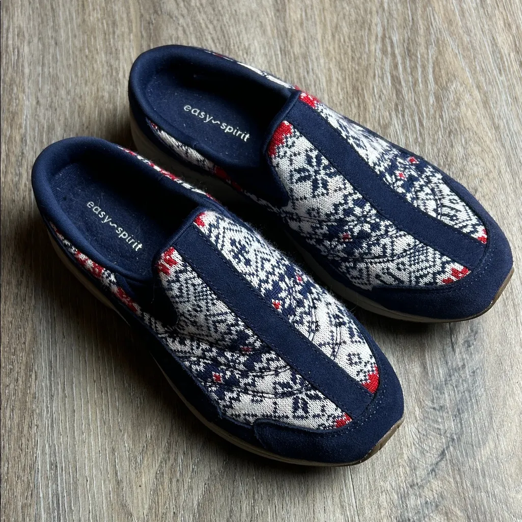 ✨ Excellent Preloved Condition ✨ Easy Spirit Traveltime Leather/Textile “Ugly Sweater” Slip-On Mules Women’s Size 7 • Navy Blue Get ready to slide into peak cozy season with these adorable Easy Spirit Traveltime clogs featuring the iconic “ugly sweater” knit pattern—aka the festive shoe equivalent of hot cocoa in a mug shaped like a snowman. 🔥 Features You’ll Love: • Cute navy & winter-sweater knit upper (red + white pattern) • Comfortable slip-on mule style •. Leather & textile upper • Supportive cushioned insole — perfect for all-day errands, lounging, or work • Durable rubber outsole with great traction • Easy Spirit comfort technology • Smoke-free & excellent condition Condition: Excellent preloved condition with minimal signs of wear—clean, cozy, and ready to warm someone else’s cute little toes. Size: Women’s 7