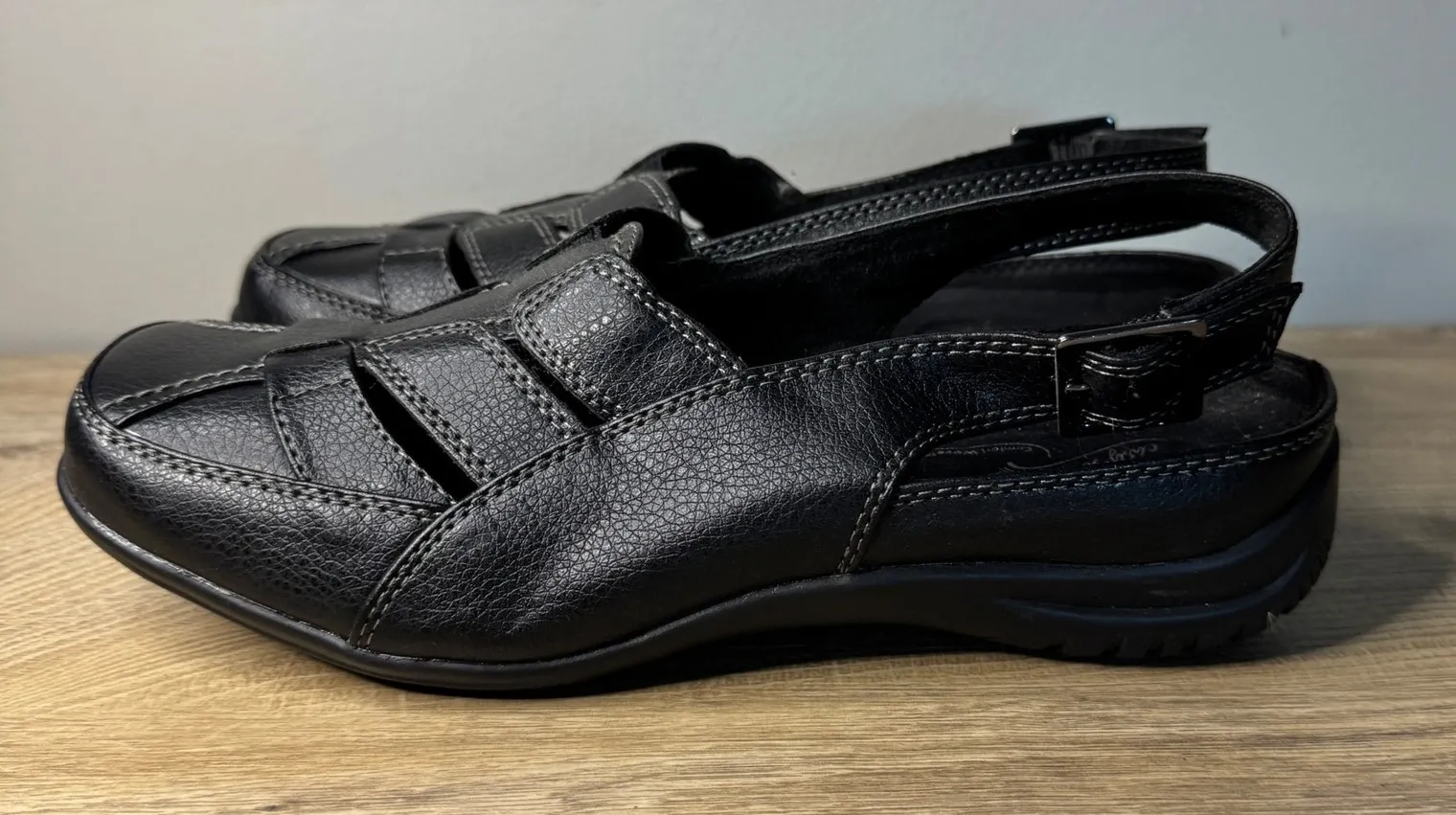 Style: Slingback Color: Black Department: Women Upper Material: Man Made Heel Style: Flat Features: Comfort, Adjustable, Cushioned, Arch Support, Buckle Closure: Buckle Pattern: Solid Shoe Width: Wide Character: Comfort Type: Sandal Model: Comfort Wave Heel Height: Flat (Under 1 in) comfort wave, fisherman sandals, slingback, casual comfort, black sandals, wide width, orthotic friendly, everyday wear, spring shoes, minimalist, capsule wardrobe, travel ready, soft footbed, ergonomic design, core black, timeless style Pre-owned in excellent condition unless otherwise stated. Please see photos for condition, measurements and details.