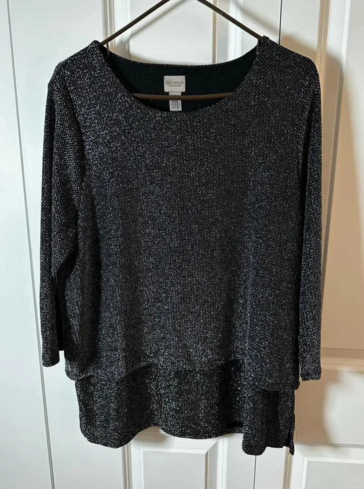 This is a pre-owned Easywear by Chico's tunic top in size 2, featuring a black base with silver spar... Show more