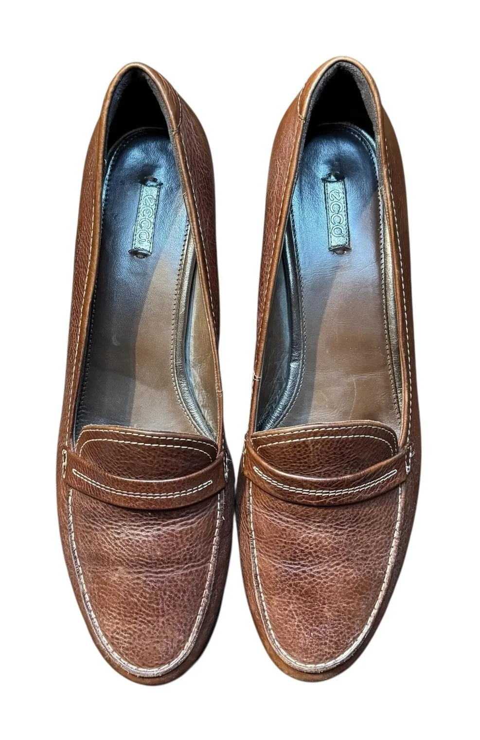 Brand: ECCO Item: Womens penny loafer shoes with low stacked heel Color: Brown Material: Pebbled leather uppers with contrast stitching; leather-lined interior Style details: Moc toe, penny keeper strap, slip-on design, rubber traction outsole Logos/markings: ECCO embossed on insole and outsole Size: EU 41 (marked 41 on sole; approx US Womens 10–10.5) Features: Comfortable cushioned footbed and durable outsoles for everyday wear Notes: No original box included
