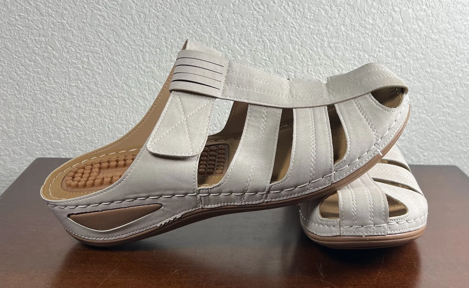 The Ecetana Women's Ivory and Tan Wedge Slip On shoes with a textured/massaging insole in size 9 are designed for comfort and style. Featuring a solid ivory color and a closed toe design, these slip-on heels are perfect for casual occasions and travel. The mid-height wedge heel offers arch support and cushioning, while the faux leather lining and faux suede outsole provide a touch of elegance. With adjustable straps and breathable features, these shoes are perfect for the spring, summer, and fall seasons, making them a versatile addition to any woman's wardrobe.