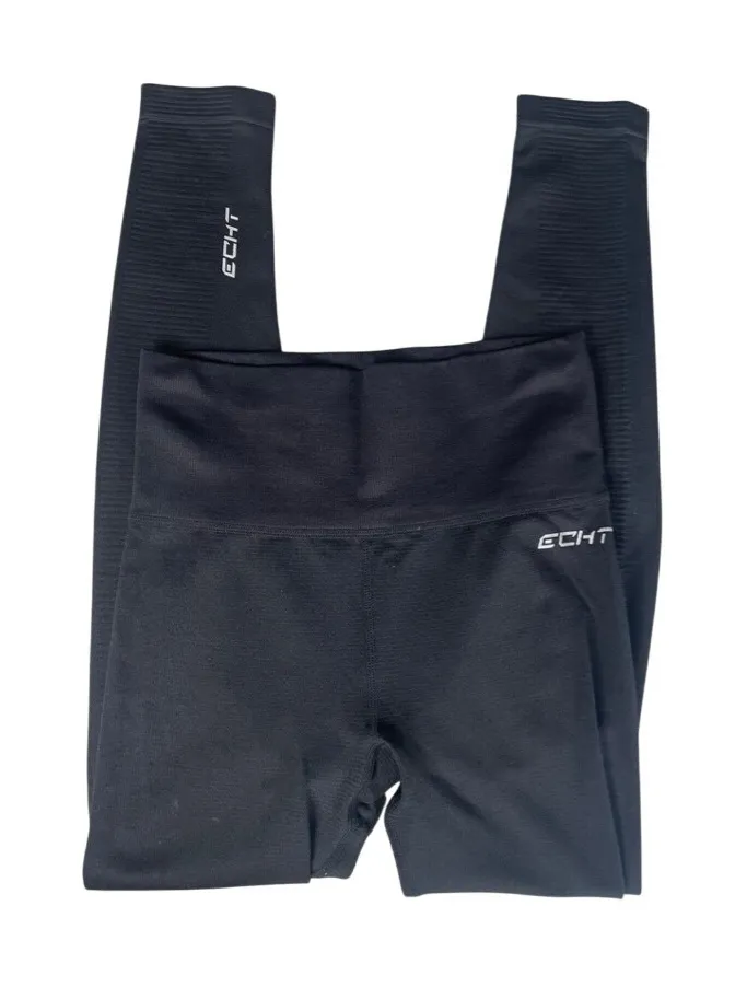Black seamless high waisted ribbed leggings. These comfortable and supportive leggings feature a flattering high waistband and a textured ribbed design along the legs for added style and detail. The seamless construction ensures a smooth, comfortable fit perfect for any workout or casual wear. Ideal for gym sessions, yoga classes, or running errands. Department: Women Style: Ankle Material: Nylon Blend Features: Seamless, Ribbed, High Waist, Textured, Stretch Type: Leggings Rise: High (Greater than 10.5 in) Performance/Activity: Yoga, Gym & Training, Cross Training, Running & Jogging Occasion: Activewear, Casual Keywords: Echt leggings, Black leggings, Seamless leggings, High waisted leggings, Ribbed leggings, Womens activewear, Athleisure pants, Gym leggings, Workout pants, Fitness apparel, Performance leggings, Comfortable leggings, Supportive leggings Excellent used condition.