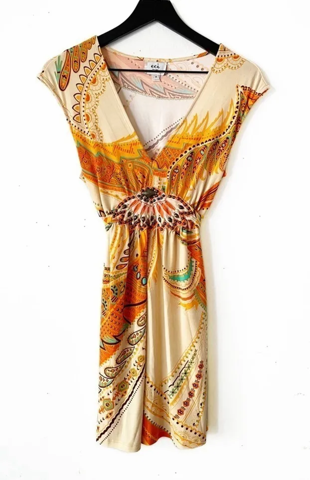 Boho glam meets effortless comfort 🌼 This ECI New York dress features a stunning paisley print in warm orange, tan, and turquoise tones with a hand-beaded waist detail that adds a luxe, artisan touch. The flattering V-neck, cap sleeves, and stretchy poly-spandex fabric make it as comfortable as it is eye-catching — perfect for brunch, vacation, or an outdoor summer event. Details & Features: • Brand: ECI New York • Size: Medium • Fabric: 96% Polyester / 4% Spandex • Print: Multicolor paisley/abstract pattern • Embellishment: Intricate beaded waist detail • Neckline: V-neck front, high back • Fit: Elastic waist, pullover style • Measurements (approx., flat): • Pit to pit: 15” • Length: 32” • Condition: Excellent preowned — no visible flaws • From a smoke-free, pet-free home Why you’ll love it: ✨ Easy to style — pairs beautifully with sandals or wedges 🌸 Perfect for vacation, brunch, or a casual party look 💎 Unique hand-beaded detailing for a one-of-a-kind finish 0-20-