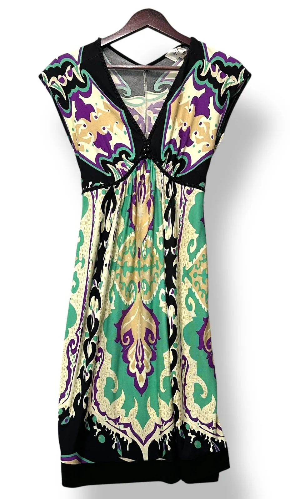 Boho, Festival, Artistic, Retro, Vintage-Inspired, Psychedelic, Resort, Statement, Y2K, Casual •Please look at the measurements for best fit- maybe compare to an item you own. •Measurements are pit-to-pit and shoulder to hem •Colors may vary slightly due to lighting and angle. • "Silk boho festival dress" • "Retro print silk dress" • "ECI New York silk vacation dress" • "Y2K boho statement dress" • "Silk summer party dress"