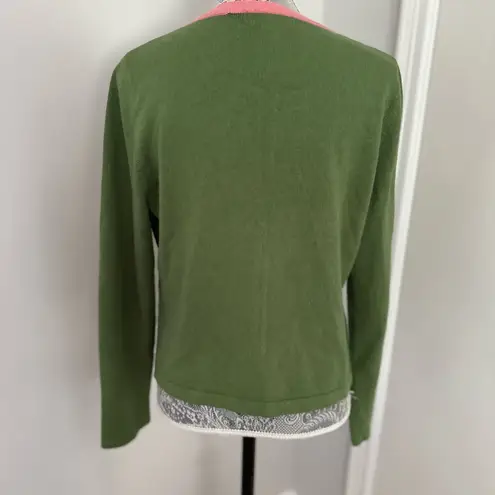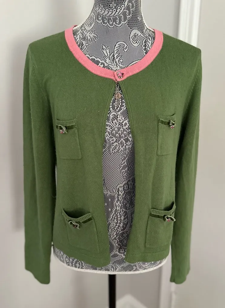 Stylish green jacket with pink accents, perfect for any occasion. Features a chic design with convenient pockets. ECI New York Sz: XL Green/ Pink Silk Angora Open Cardigan w/ Pockets Bows Jewel. Great used condition. Light normal wear. Some pilling. Toggle top button - missing jewel. No rips, stains, wholes or defects. Please see pictures for measurements and best sizing. Items listed based on tag provided. For best fit please compare measurements to a garment you already have to ensure fit for your body type.