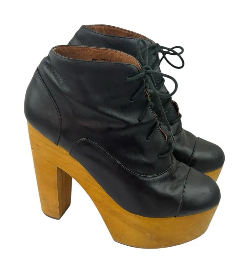 Good gently pre-owned condition. Leather upper is in good shape. Wood platform heels shows some scu... Show more