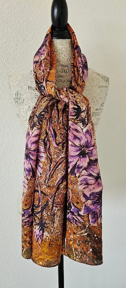 approximately 70" x 26" This elegant women's jacket features a stunning floral design in vibrant orange and purple hues. Perfect for adding a touch of sophistication to any outfit.
