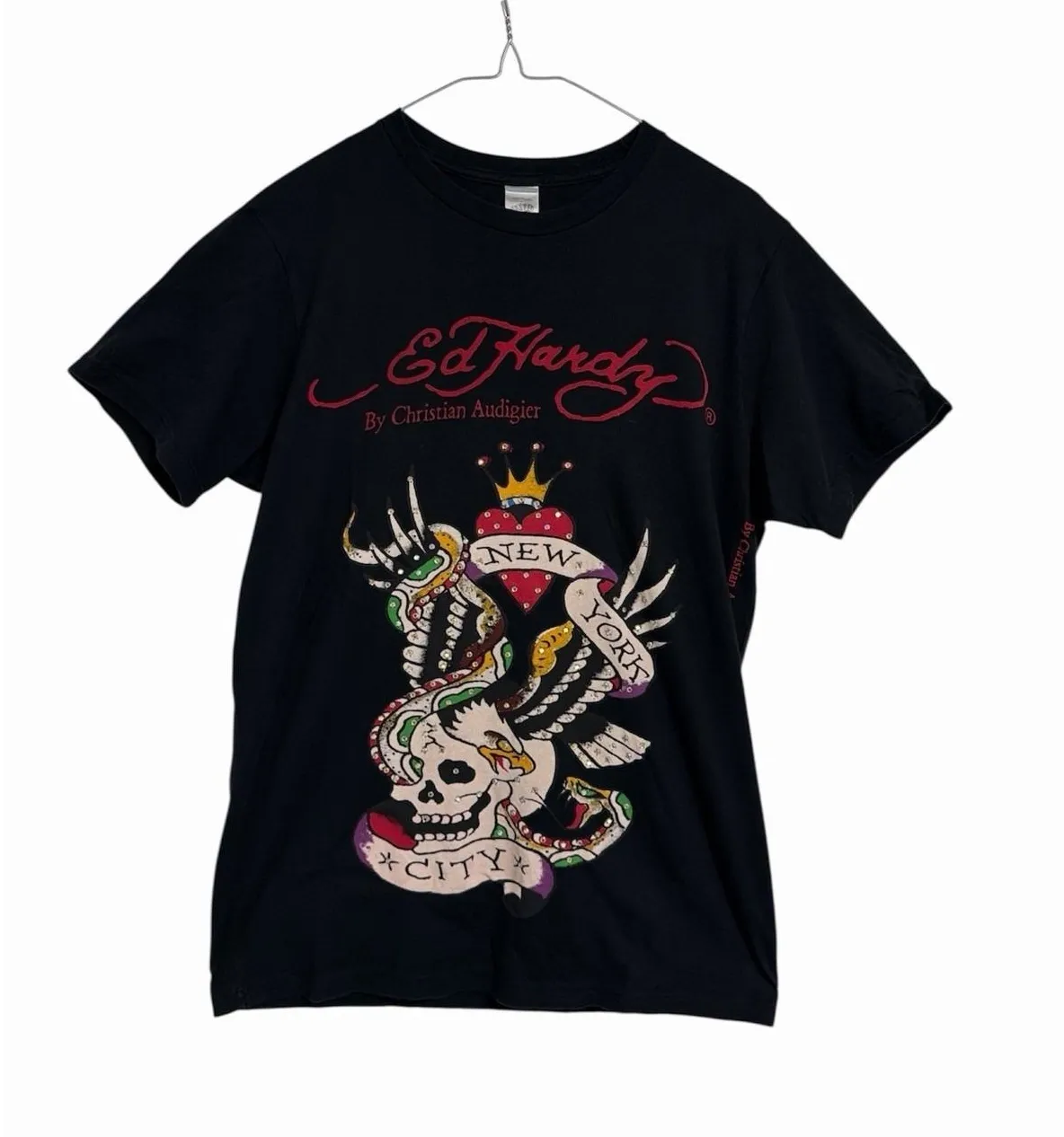 Measurements: • Chest: 18 in • Sleeves: 7 in • Full Length: 28 in Type: T-Shirt Department: Unisex Adults Material: Cotton Neckline: Crew Neck Sleeve Length: Short Sleeve Sleeve Type: Casual Sleeve Pattern: Paisley Accents: Rhinestone, Glitter Theme: Skull, City, Heart, Designer Fit: Regular Fabric Type: Jersey Occasion: Casual Closure: Pullover Season: Summer, Fall, Spring, Winter Keywords: Ed Hardy T Shirt, Christian Audigier, Skull Graphic, Snake Graphic, New York City, Streetwear, Edgy, Y2K Fashion, Graphic Tee, Designer, Unique Print, Casual, Short Sleeve