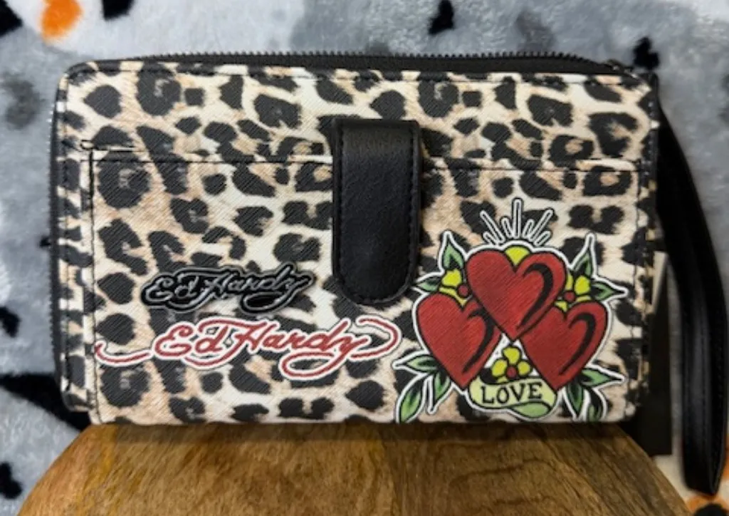 Bring iconic Y2K tattoo style to your accessories with this authentic Ed Hardy wristlet wallet. Featuring a bold leopard print exterior, signature Ed Hardy script, and a vibrant tattoo-inspired triple-heart “LOVE” graphic, this piece is the perfect mix of edgy and trendy. Compact yet functional with a secure zip-around closure and wristlet strap for easy carry. Features Authentic Ed Hardy wristlet wallet Leopard print faux leather exterior Tattoo-style triple-heart LOVE patch + Ed Hardy script logo Zip-around closure with snap tab detail Wristlet strap for hands-free carry Multiple card slots & compartments inside (add specifics if you want) Perfect for Y2K fashion lovers, collectors, and streetwear style Condition • Excellent New With Tags #EdHardy #Y2KStyle #TattooArtFashion #EdHardyWallet #LeopardPrint #Y2KAccessories #LoveHearts #StreetwearStyle #DesignerWallet #WristletWallet #FrankieAndLu