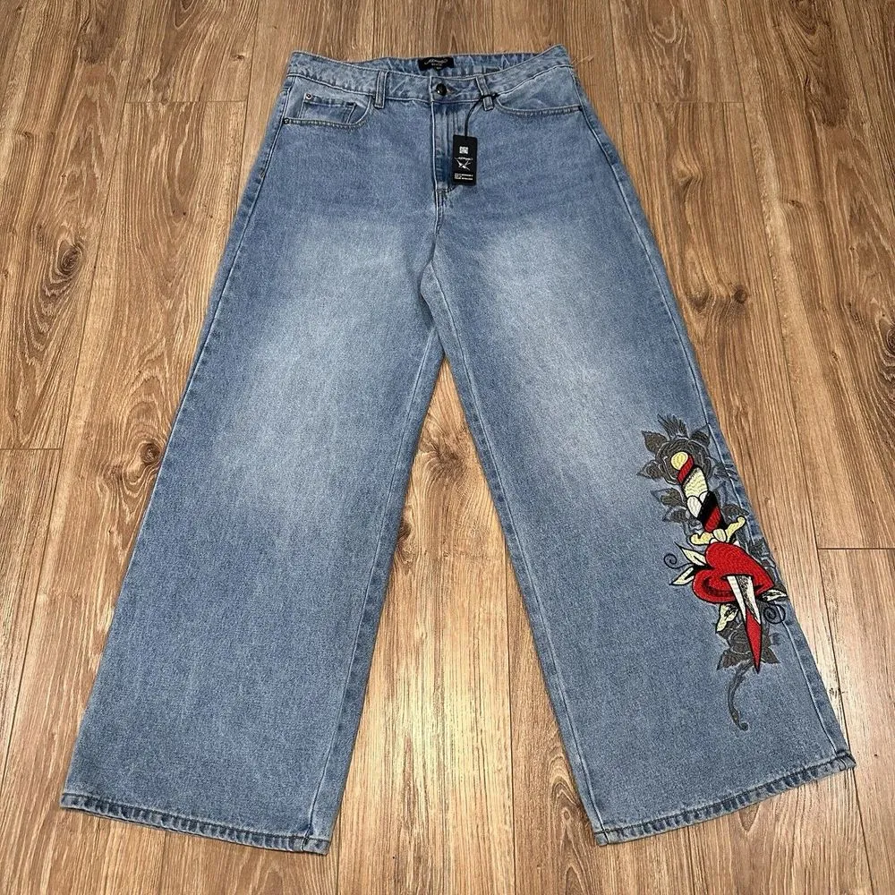These Ed Hardy Wide Leg Jeans in size 32 feature a stylish Hearts and Daggers design with embroidered accents, a back buckle, and the Ed Hardy logo. Made of 100% cotton denim in a light wash, the jeans have a relaxed fit and a high rise waist. The wide-leg style adds a retro touch to the overall heart and USA-themed design, making them a fashionable choice for any season. Item new with tags, see pictures for details. 🔥