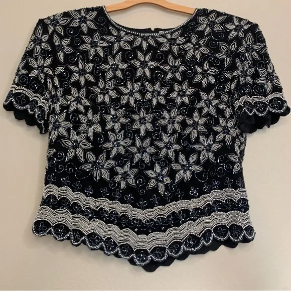 Vintage Papell Boutique Floral Beaded Evening Top Size L Main color: black with silver beads and sil... Show more