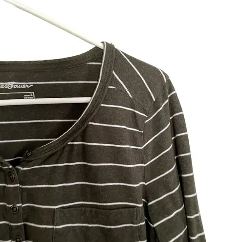 A green and white striped long sleeved shirt. Made with 100% cotton. Labeled a women's size large.
