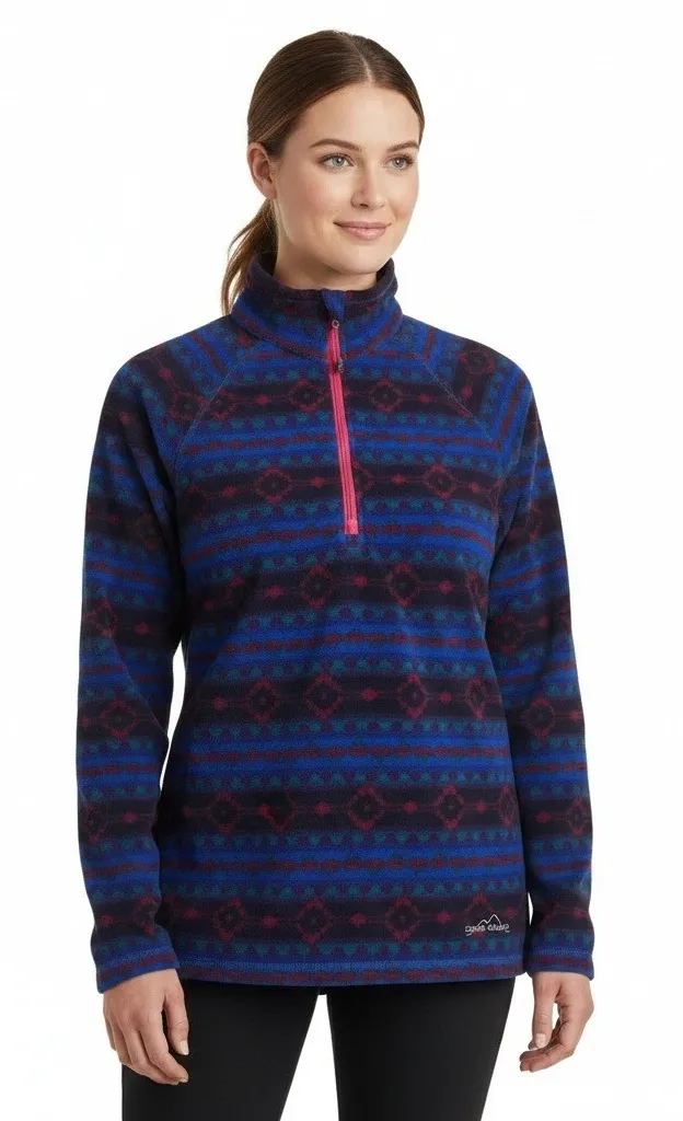 3/4 zip Eddie Bauer fleece pullover Southwestern-inspired geometric pattern in blue and red Quarter-... Show more
