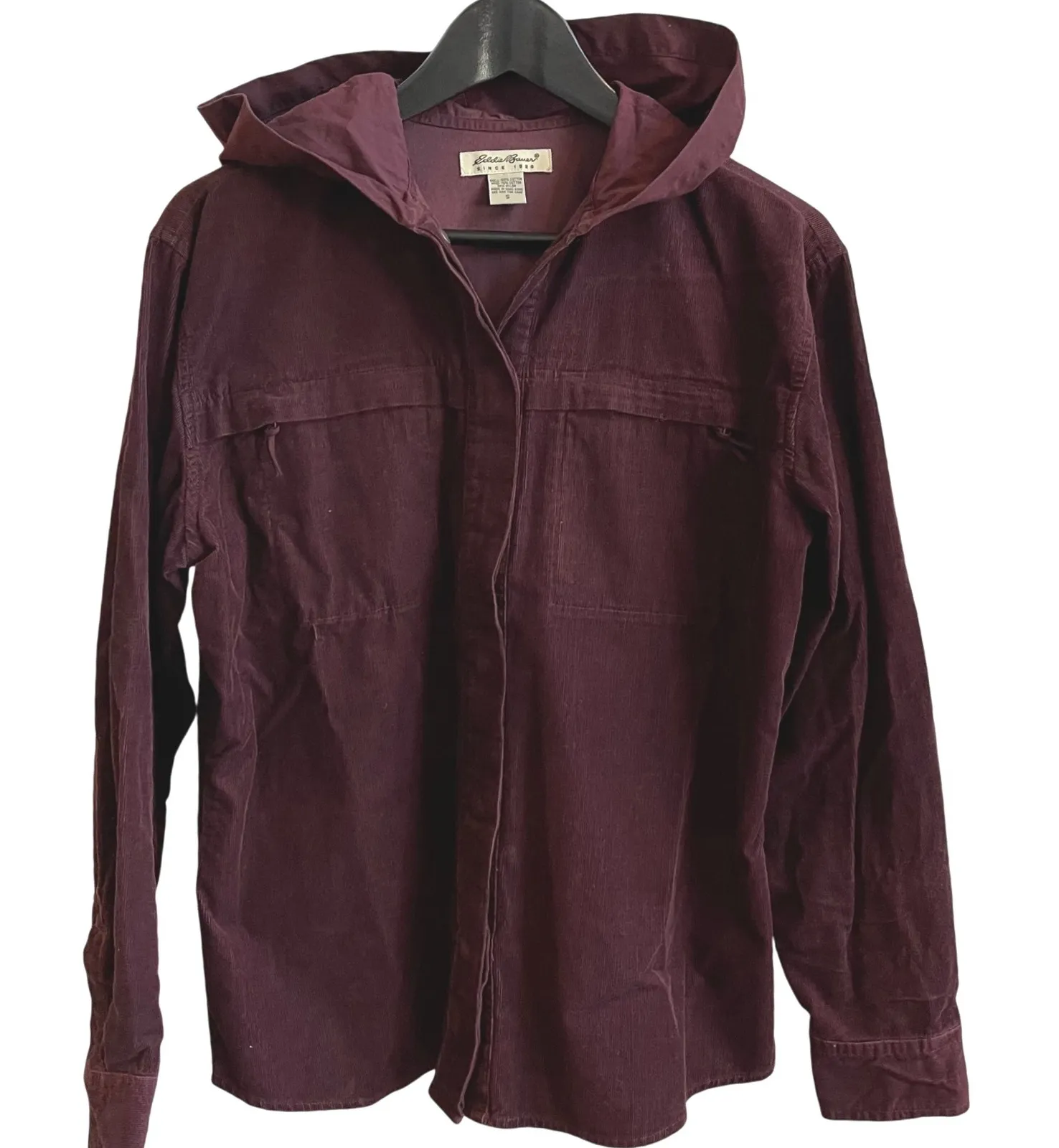 A versatile burgundy corduroy hooded shirt jacket. This piece offers a comfortable and casual style... Show more
