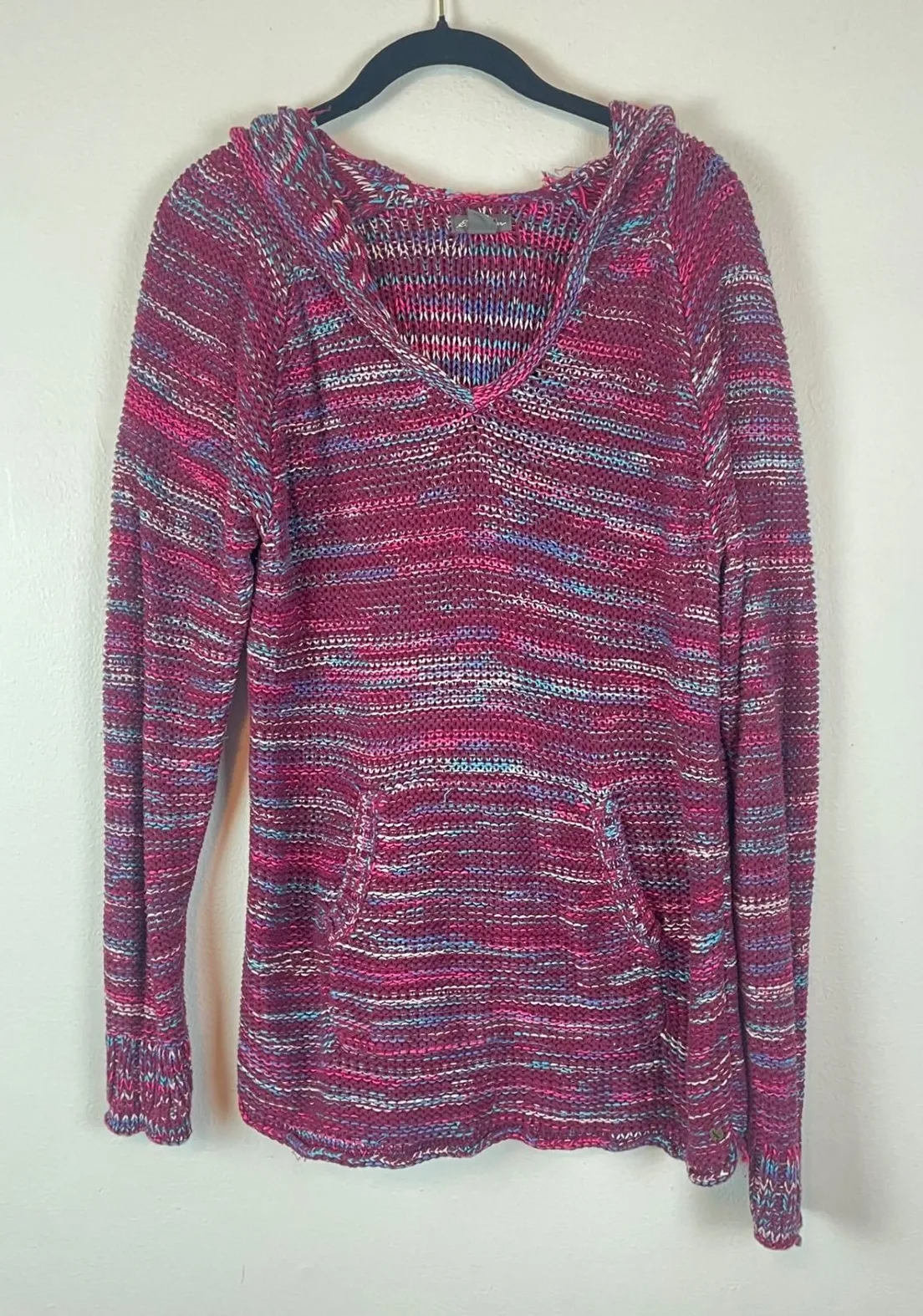 A cozy and stylish multicolored striped V-neck hooded knit sweater. This comfortable top features lo... Show more
